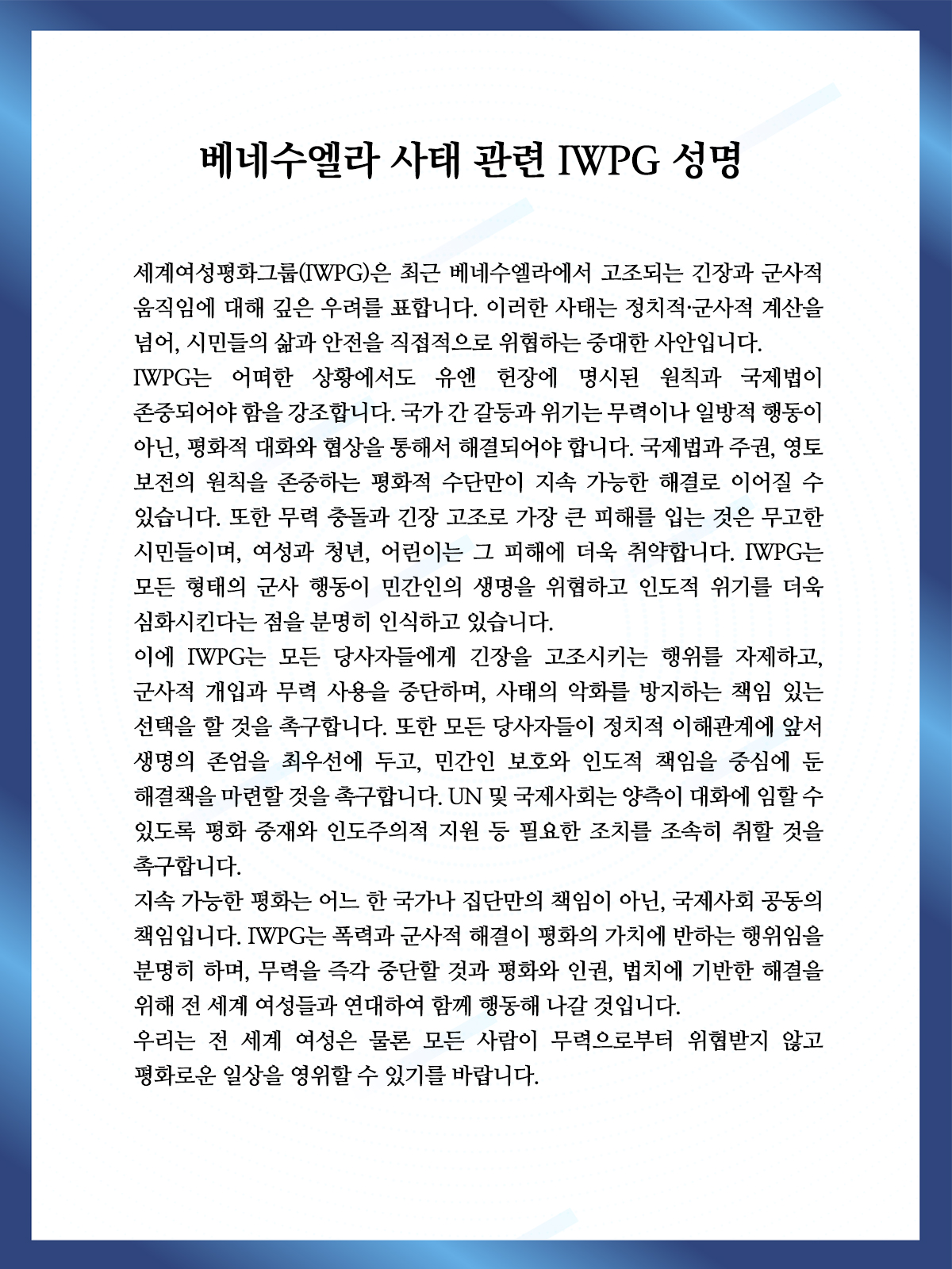 사단법인 세계여성평화그룹 IWPG는 지속 가능한 평화 세계 건설을 위해 전 세계 여성과 연대합니다.