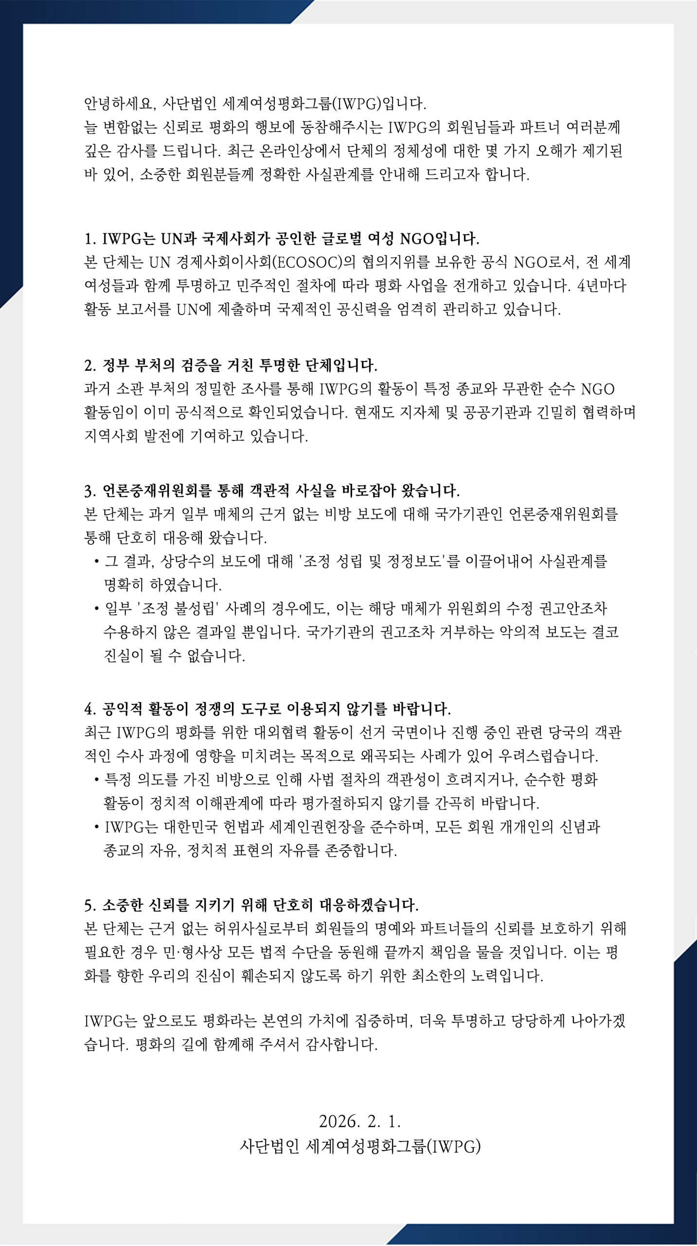 IWPG의 활동과 공신력에 대해 파트너 및 회원분들께 드리는 글