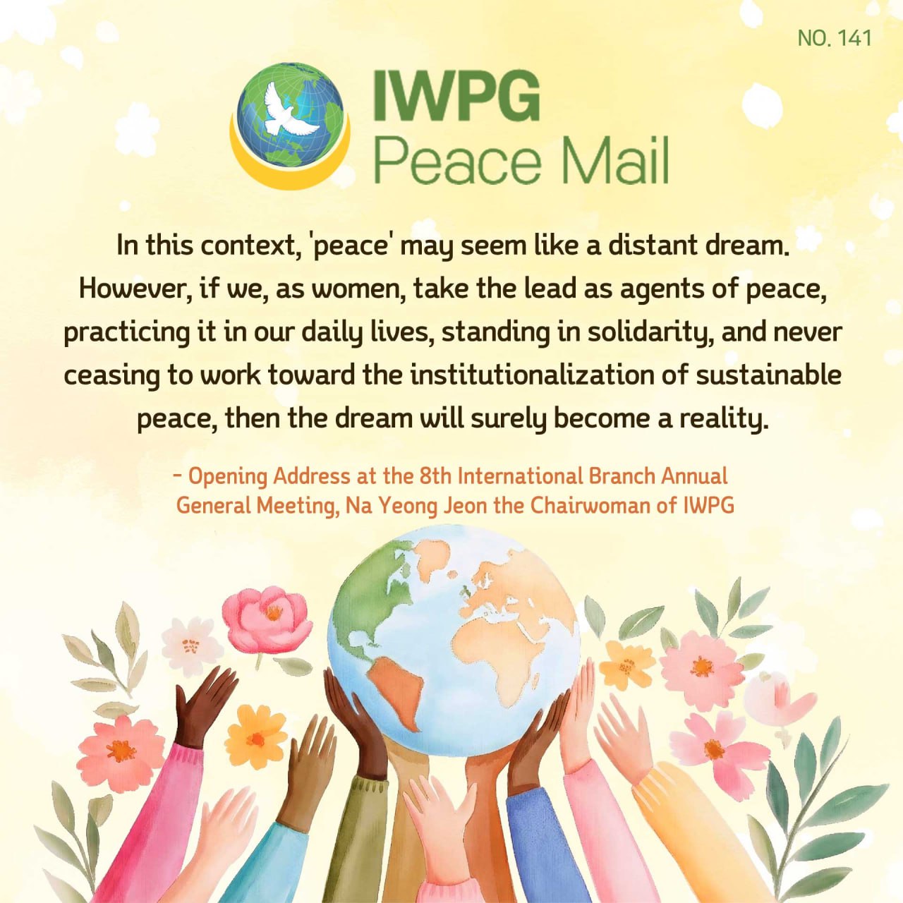 – Opening Address at the 8th International Branch Annual General Meeting, Na Yeong Jeon the Chairwoman of IWPG